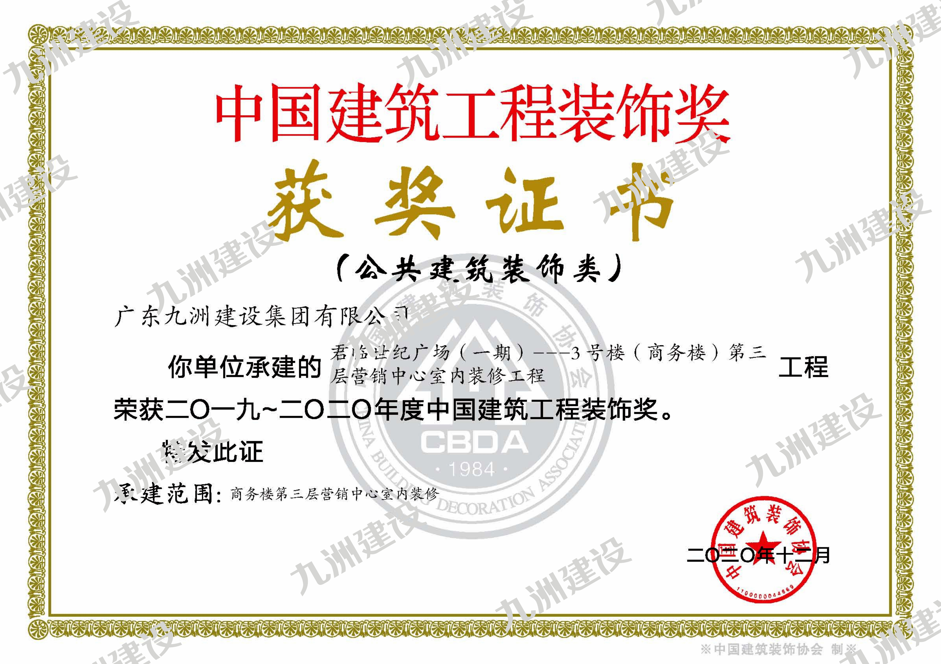 由我司承建的君臨世紀廣場(一期)--3號樓(商務樓)第三層營銷中心室內裝修工程項目,榮獲2019-2020年度“中國建筑工程裝飾獎”,是全國建筑裝飾行業最高榮譽獎,也是裝飾行業唯一經國務院批準的國家級獎項,獲獎工程的設計創意與施工工藝均須達到國內領先水平,是中國建筑裝飾行業最高榮譽。